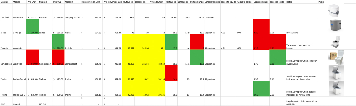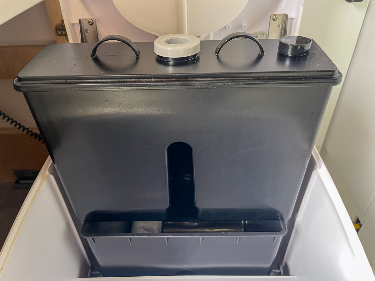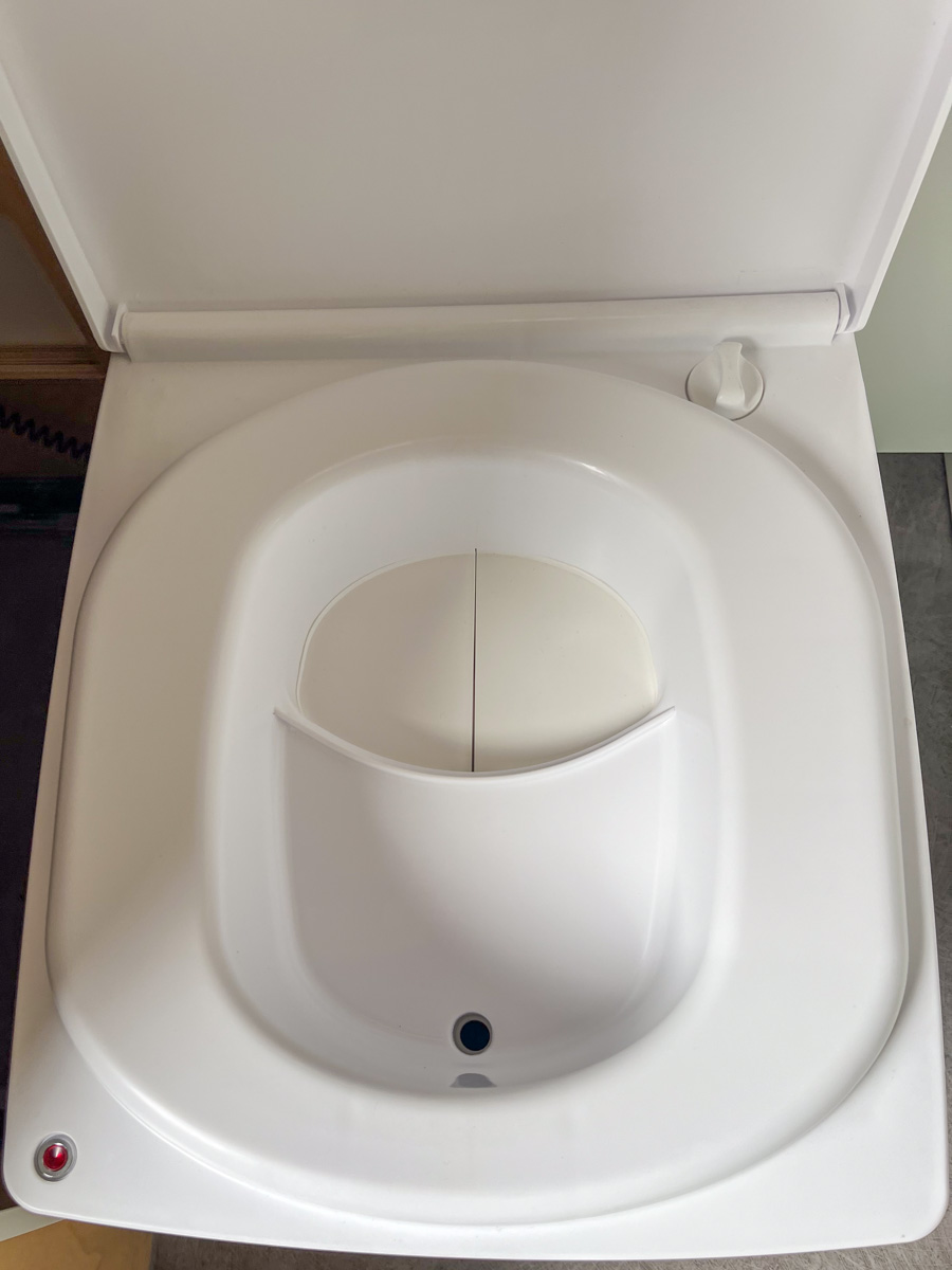 Nous avions la Porta Potti 365e, de Thetford, mais nous n’aimions plus cette toilette pour ces raisons principales : devoir la remplir d’eau (le réservoir du dessus), devoir y mettre un produit chimique (bleu pour les odeurs, le vinaigre étant à proscrire), de devoir la vider dans des endroits précis et finalement, elle peut être assez lourde lorsque pleine. Mais elle a un très bon point positif, mais quelle autonomie.