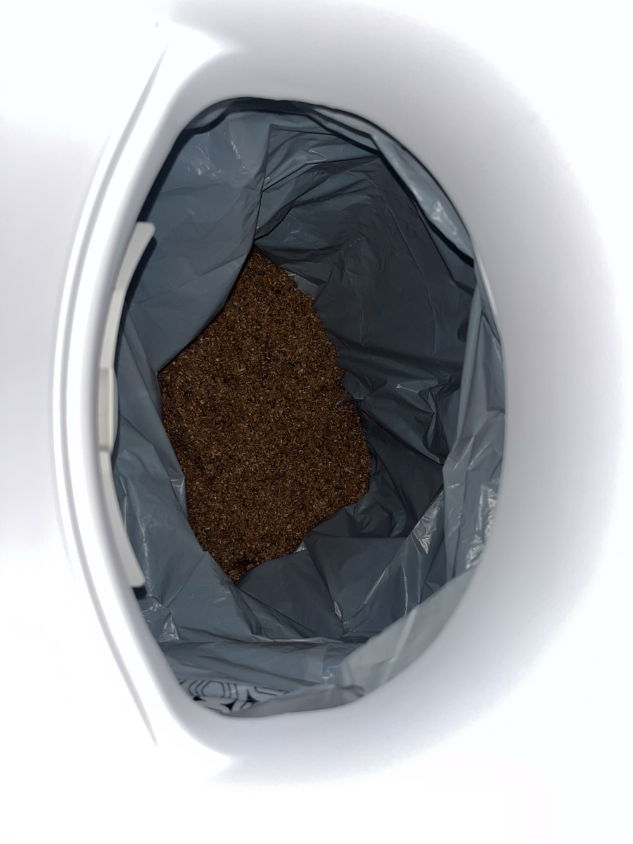 Pour la partie solide, il faut y ajouter du bran de scie ou de la fibre de coco, ou finalement de la litière. Le but est d’extraire l’humidité du solide. Est-ce que ça sent? Non, mais il y a de l’humidité, et c’est normal. Pourquoi ça ne sent pas? Parce que le problème avec les odeurs, est justement lorsque le solide est jumelé au liquide. Les deux séparés, aucune odeur. Sauf bien sur au début, lors de sa sortie :).