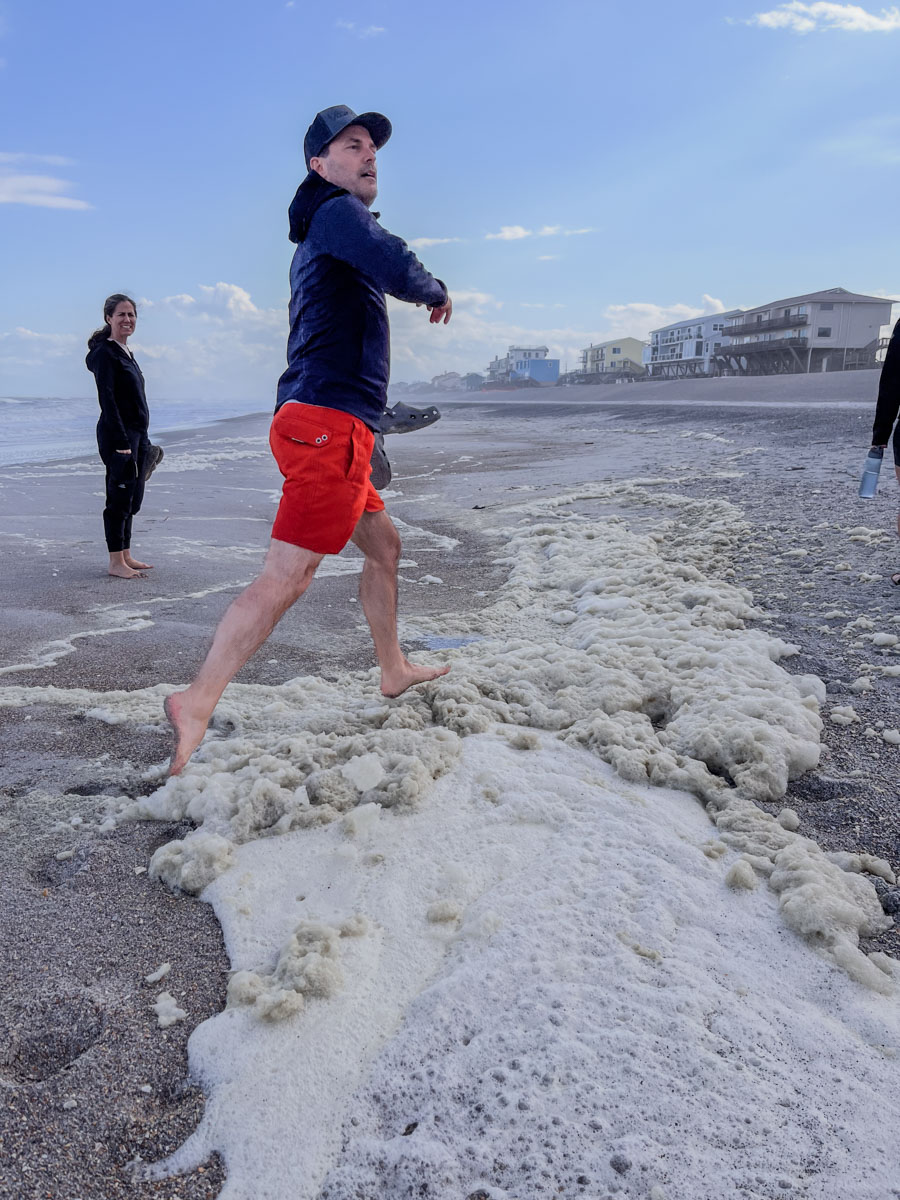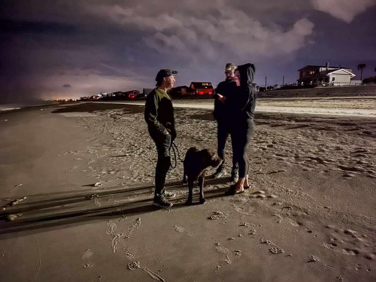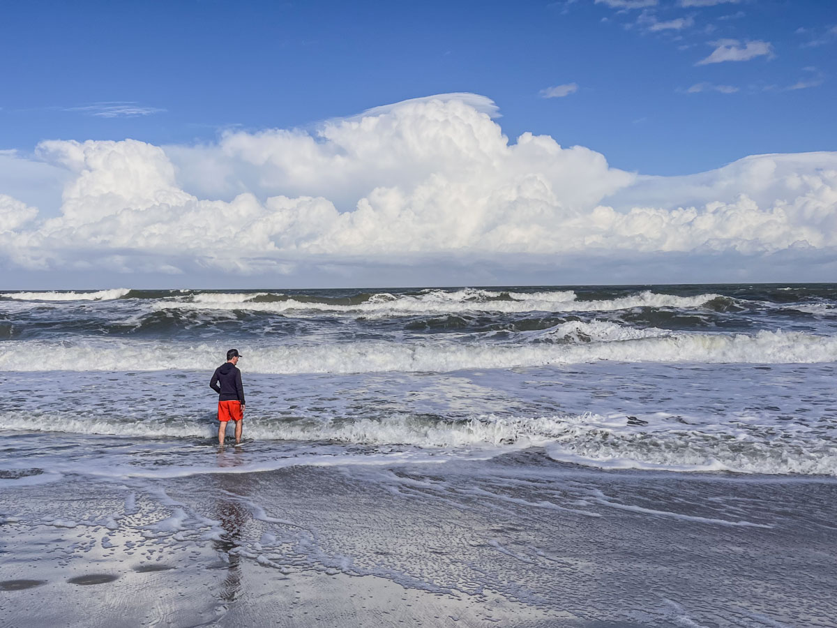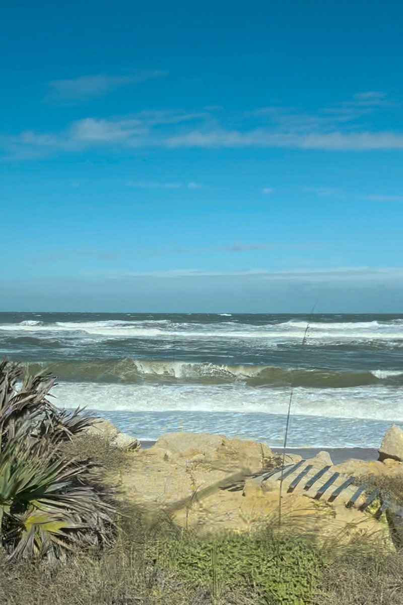 Arrivé et installé, on se tape une marche vers la rivière Tolomato. Je ne sais pas s’il y a des alligators, mais là, tout ce que je veux, c’est qu’ils voient autant de choses que nous. Pas d’alligators en vue, on poursuit la marche de l’autre côté de la rue, sur la plage. Il faut traverser la rue (la fameuse route A1A) pour se retrouver sur la plage, c’est un petit détail. Les vagues sont fortes, le vent est fort, un front froid arrive. On est content de se retrouver enfin.