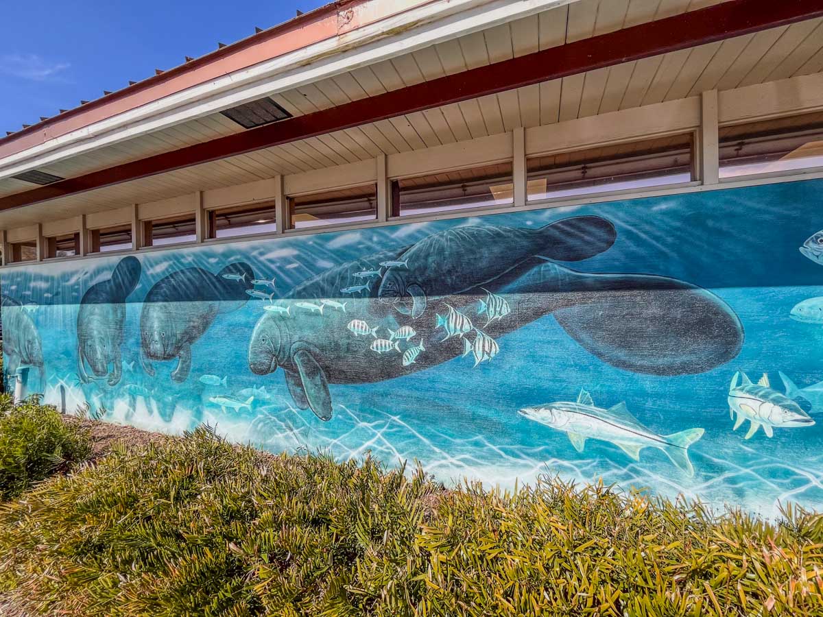 Dans la fenêtre du bureau du ranger (qui est fermé aujourd’hui’hui, tsé le 365 jours…) , une affiche, si tu veux voir les lamantins, tu dois aller au Homosassa Springs. On parle avec un ranger, en camion, et il nous dit d’aller où on verra une grosse statue de lamantin sur la route. On ne niaise pas avec ça, go. Ce n’est pas loin.