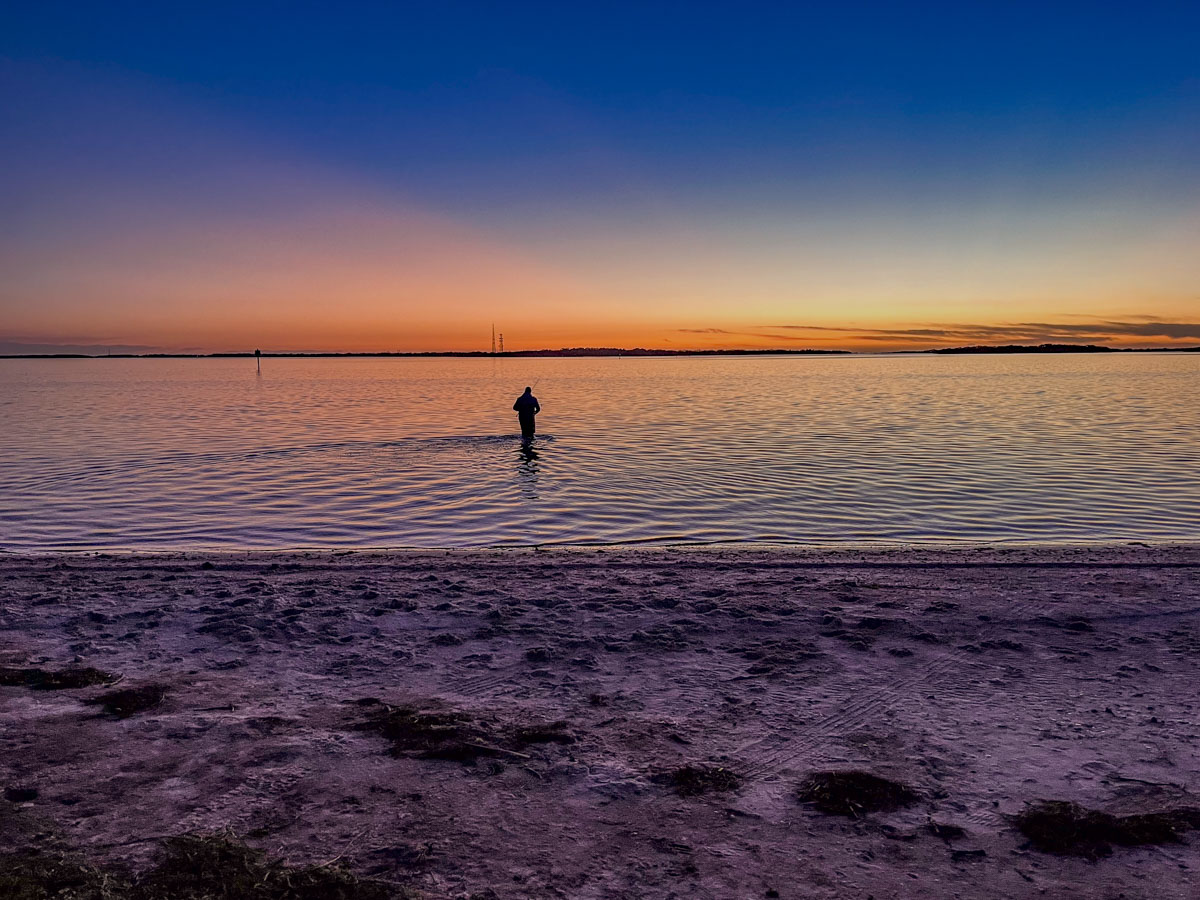C’est un quartier très beau. Wow, les routes, wow, il n’y a pas grand chose de laid ici. On se dirige vers le Fort De Soto County Park (il y a camping, magnifiques plages, on ne les verra pas cette fois). Sur la route, on voit des pêcheurs, et surtout une van. Je dis à Gaby de reculer et d’entrer dans le stationnement sur le bord de la plage. On est au paradis. On pourrait même y rester. Je vois Gaby jaser avec un gars, je me suis dit, il ne peut pas être anglophone. C’est en fait un québécois qui adore la pêche. Il passe ses 5 mois d’hiver ici. Il nous offre un poisson préparé (s’il en attrape un). On jase avec une canadienne qui est en van. Son mari pêche aussi, et elle dit que l’endroit est très sécuritaire. Un ranger fait sa tournée la nuit. On peut donc y rester pour la nuit. On n’y restera pas, on va au Cracker rejoindre nos compagnons de voyage qui nous attendent. L’endroit n’aura été qu’un rêve.
