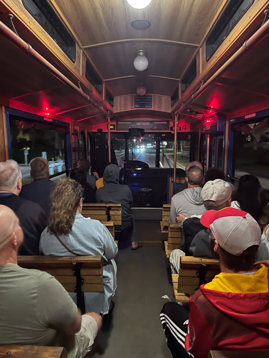 Sans pitou, on peut prendre la navette (le petit train). Il est encore 19:00, et la navette sur termine à 22:00. On a le temps en masse. On attend à l’arrêt, et elle tarde à venir. Il existe une application sur le iPhone, pour la suivre, mais il faut un compte US. Je n’ouvrirai pas un compte juste pour ça.