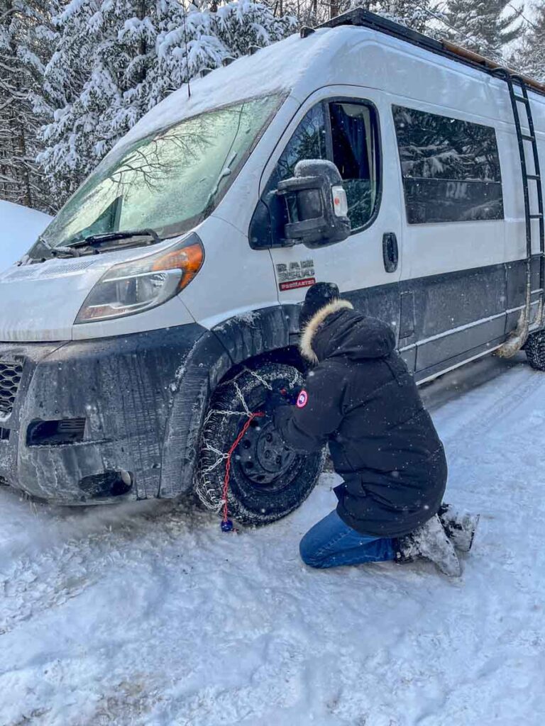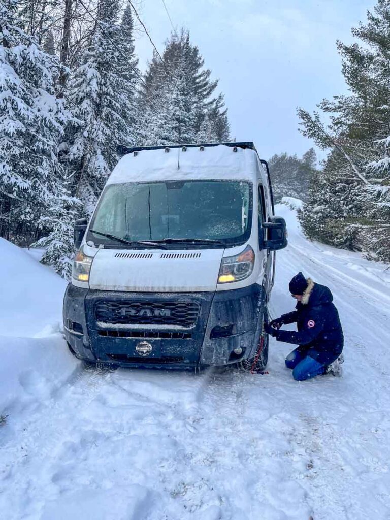Une bonne idée est de se procurer un set de chaines à neige. Normalement, lors de l’utilisation, on doit limiter la vitesse à 50km/h. C’est ben correct. De toute façon, quand tu es pris, tout ce que tu penses est de te déprendre, et non faire de la vitesse avec ton Promaster. Une note importante : la van est lourde, très lourde (je sais, je n’arrête pas de le dire), donc il ne faut pas lésiner sur le prix des chaines. Il ne faudrait tellement pas qu’elles brisent en roulant, et que la chaine sectionne un boyau de liquide à frein. On a des Peerless, avec ajustement automatique, c’est génial.